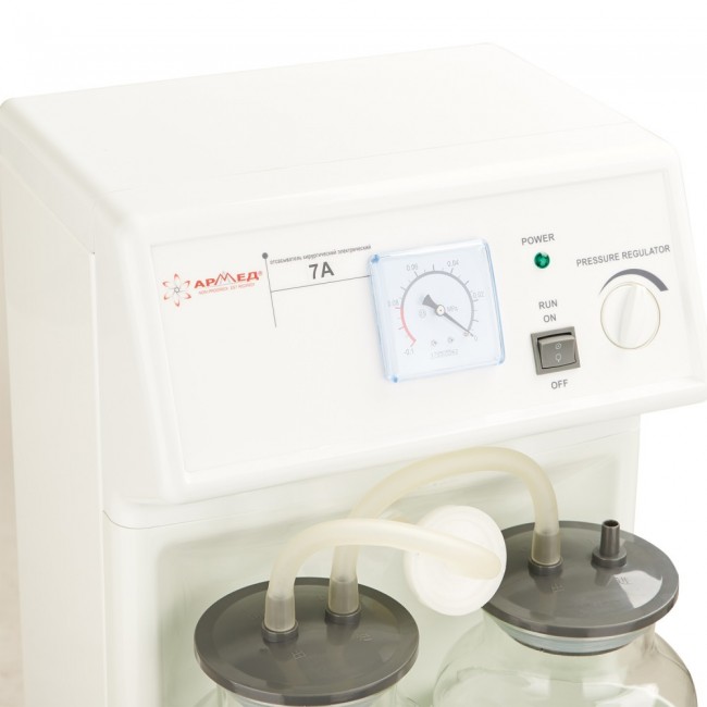 Отсасыватель 7А легок в обслуживании, обладает надежным механизмом, металлическим корпусом с пластиковой панелью управления, снабжен антибактериальным фильтром и механической защитой от переполнения. Оснащён колёсиками и педалью дистанционного включения. Работает с низким уровнем шума.