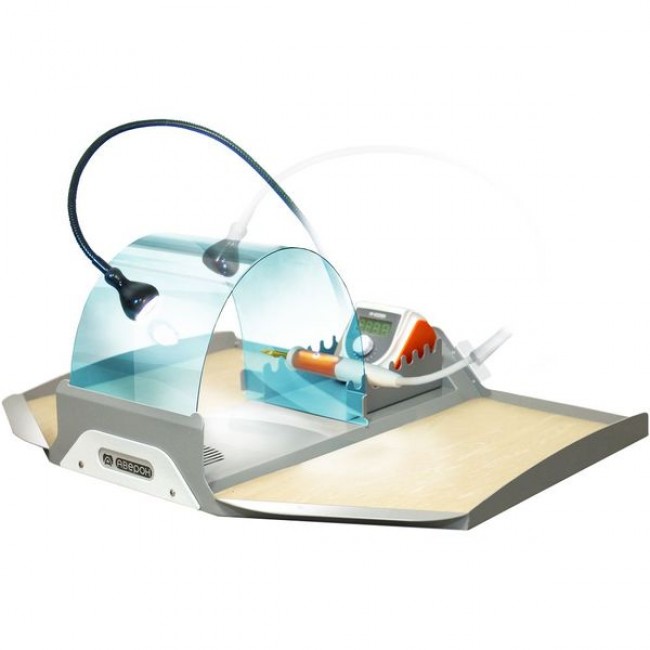 Настольный вытяжной модуль. Позволяет оперативно и без дополнительного инструмента организовывать и сворачивать на любом столе рабочее место для механической обработки. Отходы локализуются в пределах большой рабочей площади поддона. После каждой работы поддон с отходами легко вытряхивается и у вас остается чистое рабочее место. В конструкции предусмотрены защитный экран и дополнительная подставка для наконечников бормашины, электрошпателя и пульта управления.