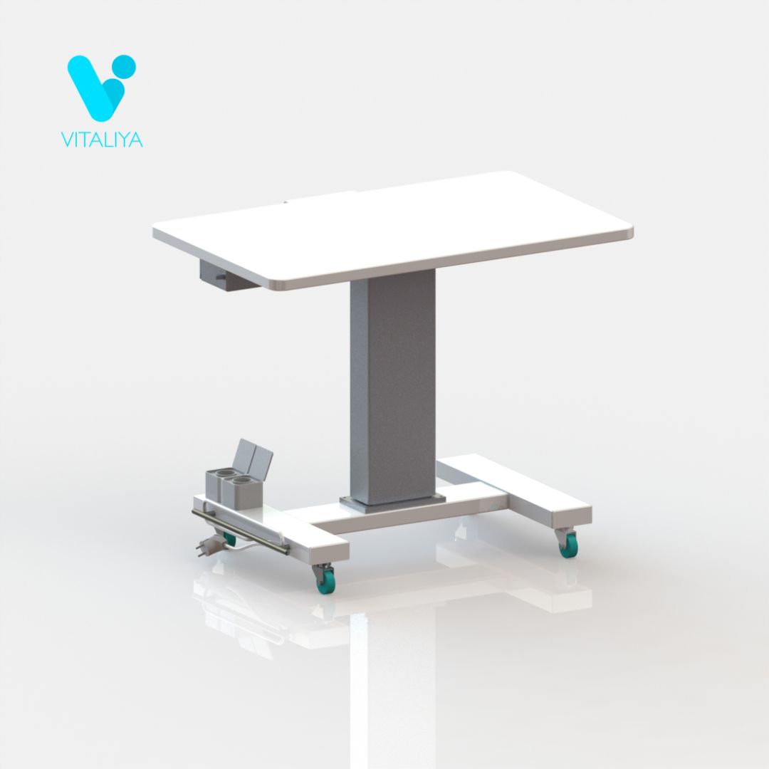 Рабочая поверхность выполнена из постформинга. Регулировка по высоте выполняется за счёт электропривода. На основании стойки расположена одна розетка на два гнезда со шторками. Стойка установлена на колёсные опоры диаметром 50мм, два колеса с тормозом.