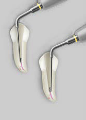 Рабочая часть насадки расположена на её кончике, это последние 2 – 3 мм. Кончик насадки (рабочую часть насадки), следует располагать соосно продольной оси зуба. Насадкой, не погружая её сразу в десневую борозду, необходимо пройти по периметру зуба, убирая доступные для обзора наддесневые (или поддесневые) отложения, без чрезмерного латерального давления. Начинайте работу с лицевой стороны зуба перемещаясь к мезиальному или дистальному краю.
