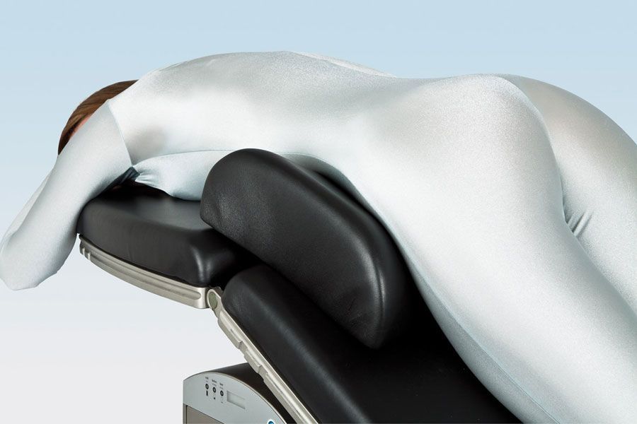 В положении лежа на животе подушка с мягкой обивкой, состоящая из двух частей, может значительно снизить давление брюшного отдела. Клиновидная форма позволяет подкладывать подушку уже лежащему на столе пациенту слева и справа для упора в области живота.