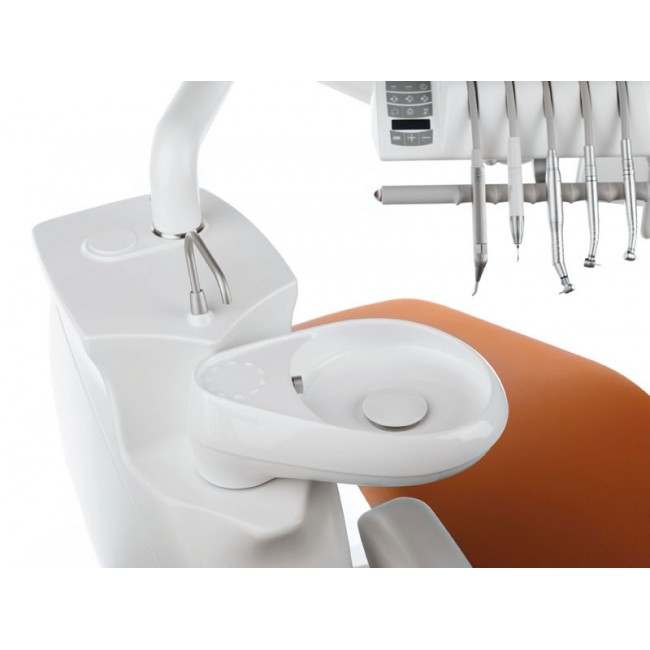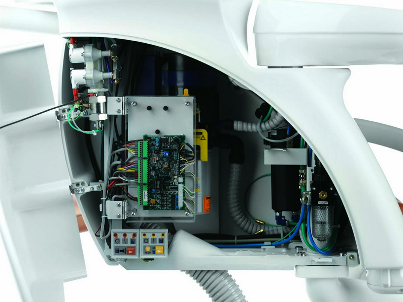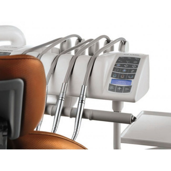 - Два аспирационных шланга (слюноотсос, и пылесос) и два свободных держателя для дополнительного инструмента: пистолет вода-воздух, полимеризационная лампа, интраоральная камера или эжекторный слюноотсос.
