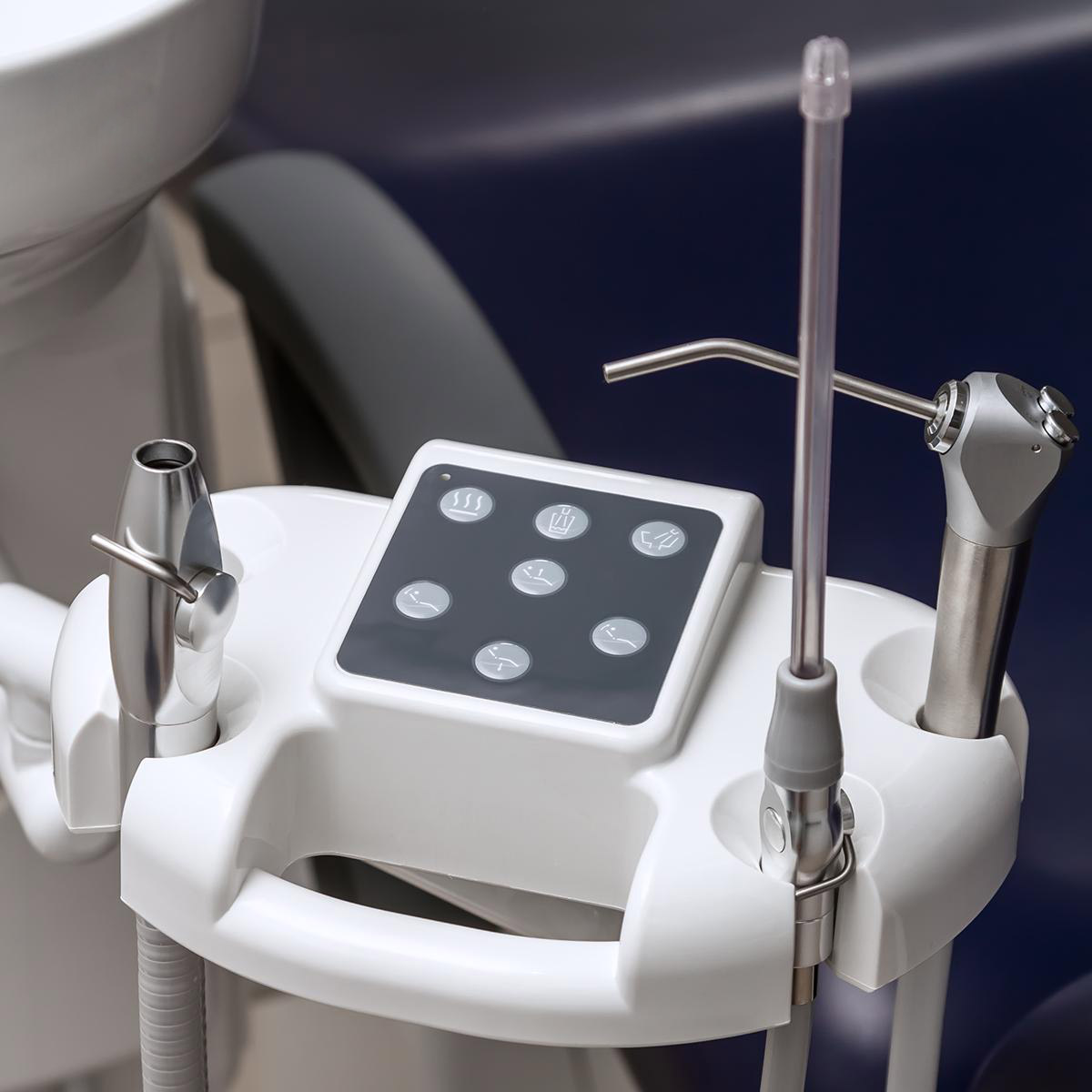 - Модуль ассистента трёхшарнирный, на четыре инструмента, с пылесосом, слюноотсосом и пистолетом вода-воздух, так же оснащён панелью управления креслом и гидроблоком.