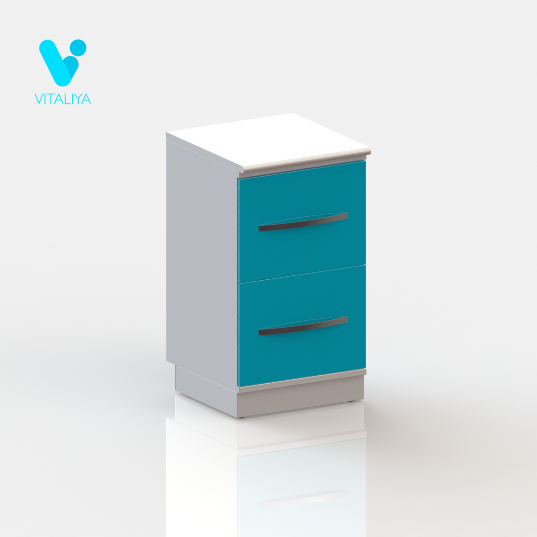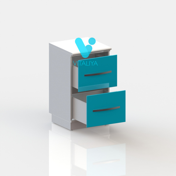 Тумба металлическая цельносварная, выполнена из листового металла толщиной 1 мм и окрашена полимерно-порошковой краской. В тумбе два выдвижных ящика, установленных на шариковые направляющие скрытого монтажа с доводчиками, производства компании HETTICH, Германия. Фасады ящиков укомплектованы ручкой-скобой из нержавеющей стали с межцентровым расстоянием 320 мм. Тумба изготовлена в варианте на подиуме высотой 100 мм с регулируемыми опорами.
