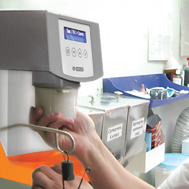 - Колба фиксируется в вакуум-смесителе за счет разрежения: подносим колбу со смесью – нажимается контактный выключатель, создается вакуум (колбу можно отпустить), после чего начинается замес. Когда заканчивается заданное время, вакуум-смеситель автоматически отключается.