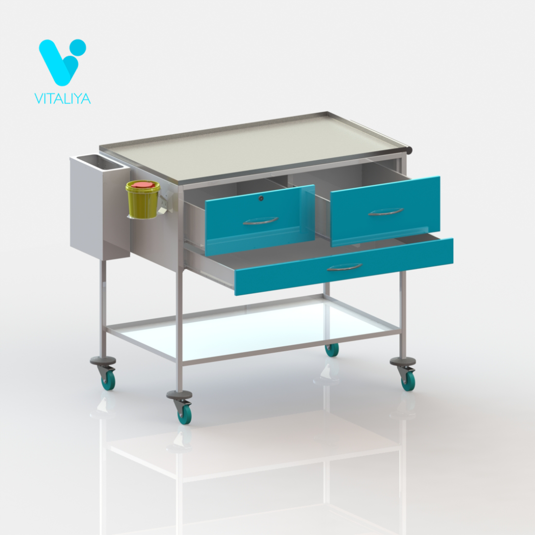 Столик медицинский СММ-03 с тремя ящиками. Каркас выполнен из профильной трубы 20 х 20, корпус и нижняя полка из листа холоднокатаной стали толщиной 1 мм. Рабочая поверхность и верхняя полка из нержавеющей стали. Ящики установлены на роликовые направляющие, левый ящик укомплектован замком. На левой стенке столика расположен держатель мусорных пакетов и контейнер для медицинских отходов класса «Б». На правой стенке ручка для перемещения. Столик установлен на колёсные опоры диаметром 75 мм, два колеса с тормозом.