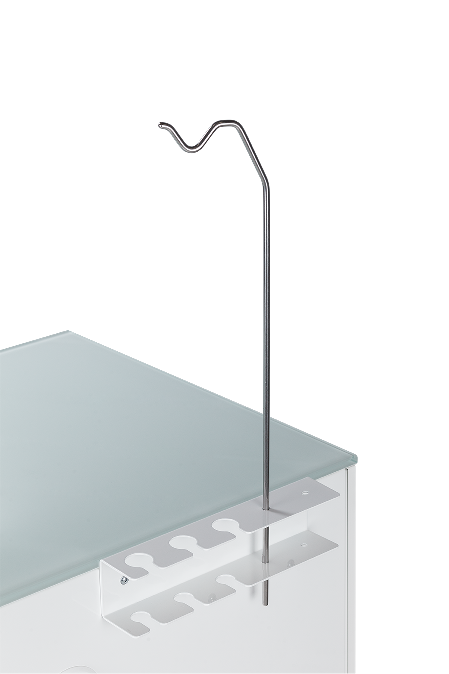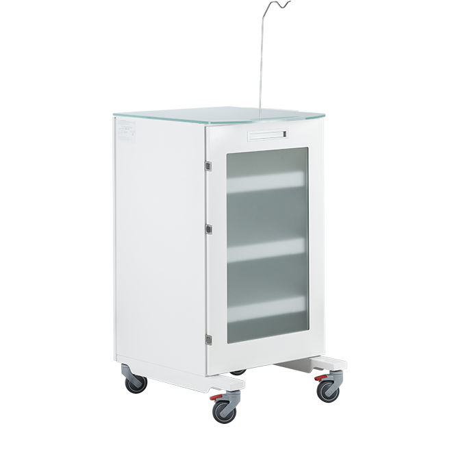 С тремя выдвижными полками. Столик оснащён специализированным держателем для стоматологических наконечников, а также штативом для крепления системы подачи физ.раствора. Столик установлен на колёса диаметром 75мм, два колеса с тормозом.