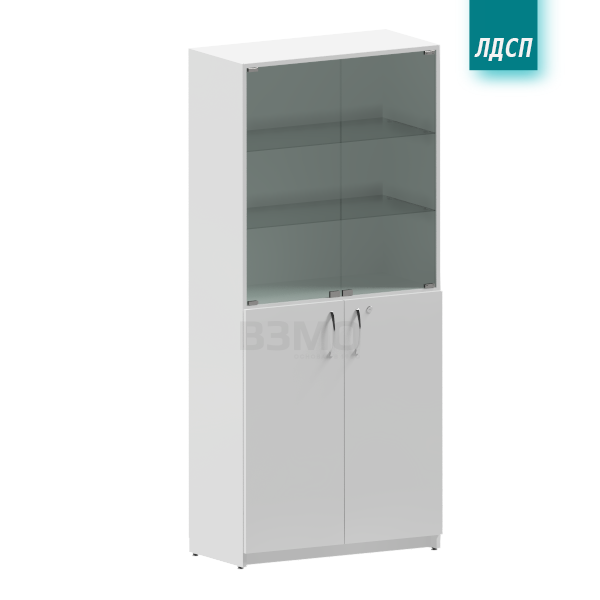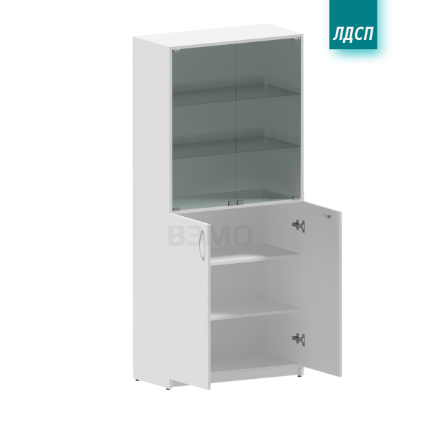 2 дверцы (нижние) из ЛДСП, 2 дверцы (верхние) из стекла, 2 полки (в нижней секции) из ЛДСП, 2 полки (в верхней секции) из стекла.