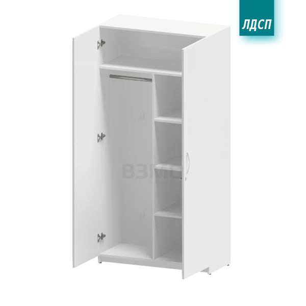 Правая секция с 3 полками (ЛДСП), оснащена мебельным замком. Левая секция оснащена штангой для одежды. В верхней части шкафа ниша высотой 220мм