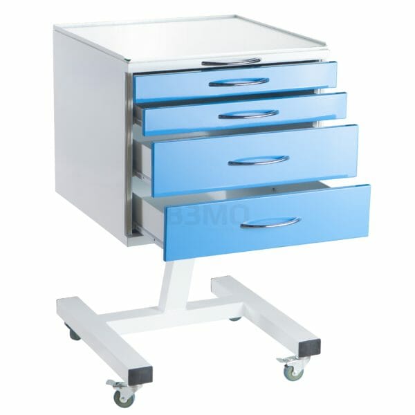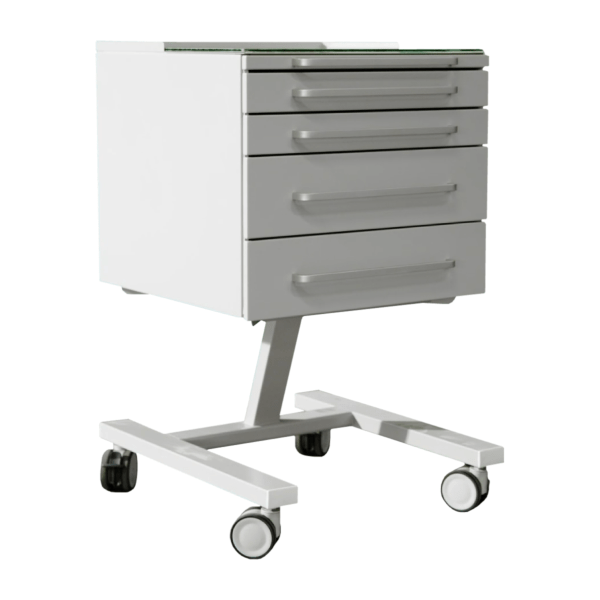 Передвижная тумба имеет четыре ящика на опоре, сверху полка из стекла. По желанию заказчика, так же в столике можно сделать три выдвижных ящика. Опора имеет четыре колеса серой резины Ø50 мм. Столик может использоваться отдельно, а так же отлично сочетаться с набором мебели.